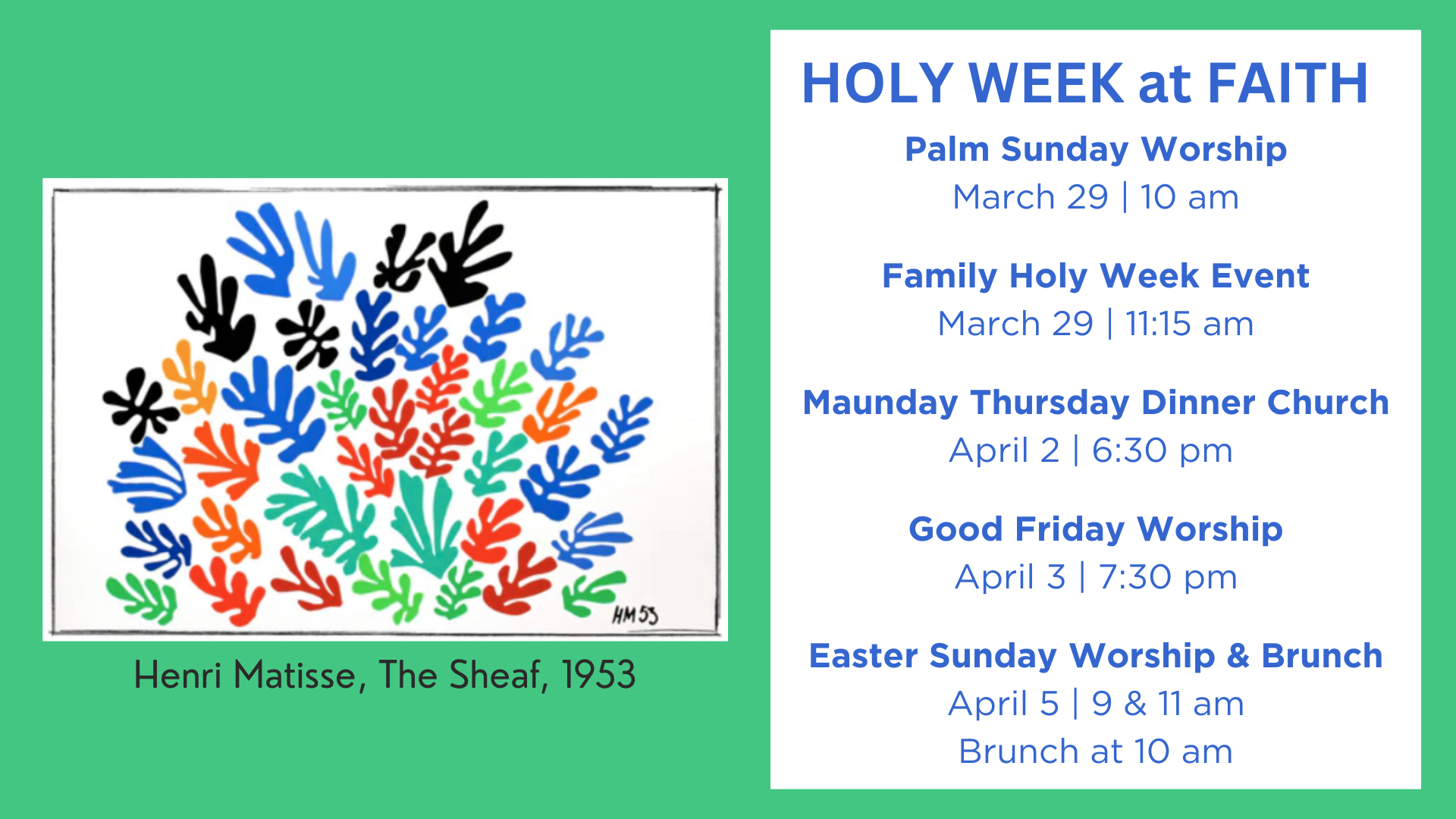 Join us for the following Holy Week and Easter events at Faith!