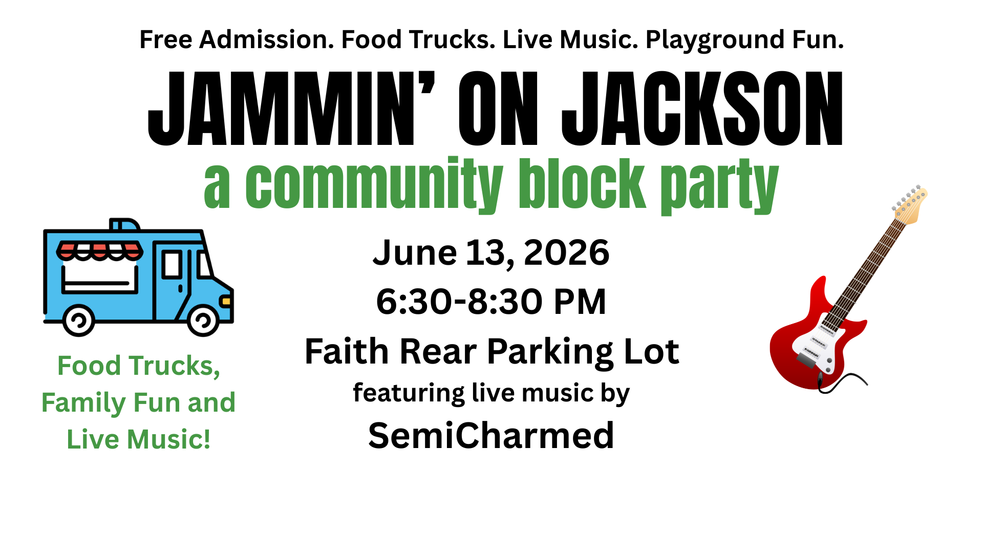 Mark your calendars for the Faith Jammin’ on Jackson block party on June 13th from 6:30-8:30 PM at the rear parking lot. There will be live music from local band SemiCharmed, food trucks and games in the playground area for kids. BYOB for adults. No entry fee. Cash and mobile payment accepted by food trucks. Service dogs are welcome, no pets please. BYOB – must be 21 and display ID. Bring a lawn chair or blanket!
