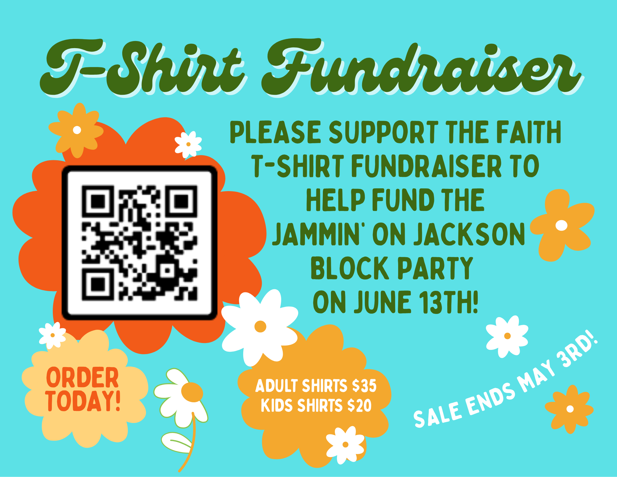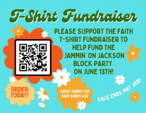 Faith is holding a t-shirt fundraiser to help fund the Jammin’ on Jackson block party on June 13th. T-shirts are $35 for adults and $20 for children. Order your t-shirt today using the QR code or this link. The sale runs through May 3rd!